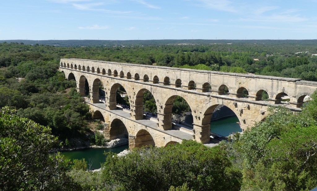 The Pont du Gard is an ancient Roman aqueduct bridge built in the first century AD to carry water over 50 km (31 mi) to the Roman colony of Nemausus (Nîmes). It crosses the Gardon River near the town of Vers-Pont-du-Gard in southern France. The Pont du Gard is the highest of all Roman aqueduct bridges, and one of the best preserved. It was added to UNESCO’s list of World Heritage Sites in 1985 because of its historical importance.